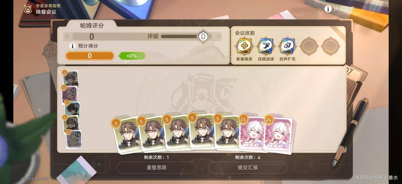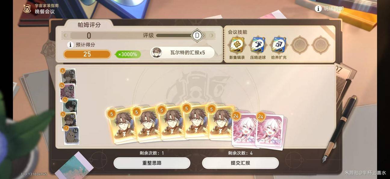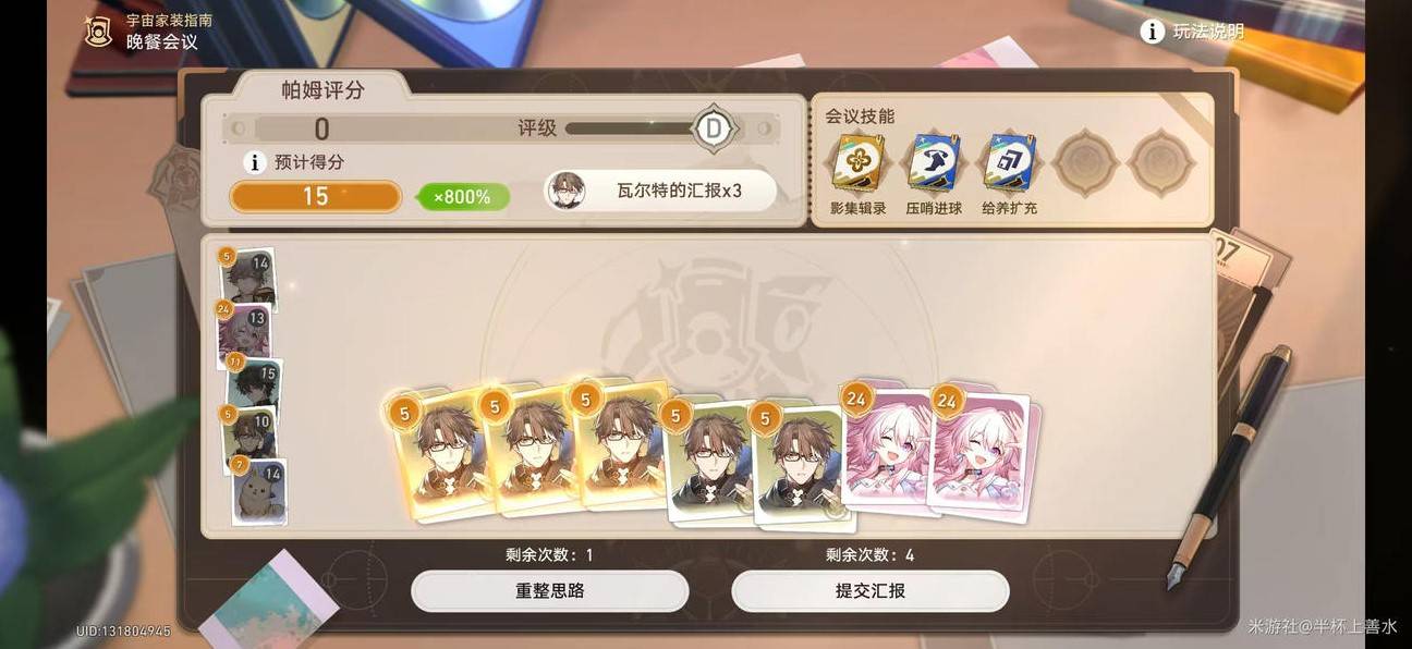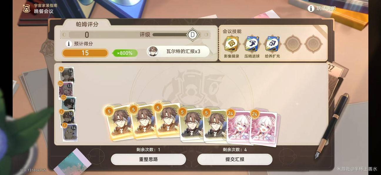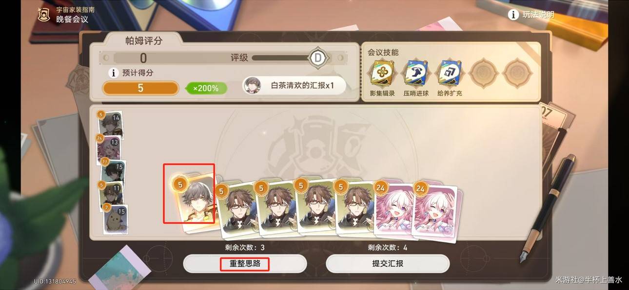 因为每次给的汇报是随机的,如下图我已经出来4个杨叔,如果再来一个的话可以提升3000%,选中开拓者报告,点击重整思路,会把开拓者这张报告随机掉