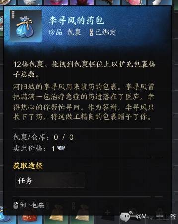 出门右前方桥上有一个NPC,与其对话,上交药包,即可获得第二个14格背包