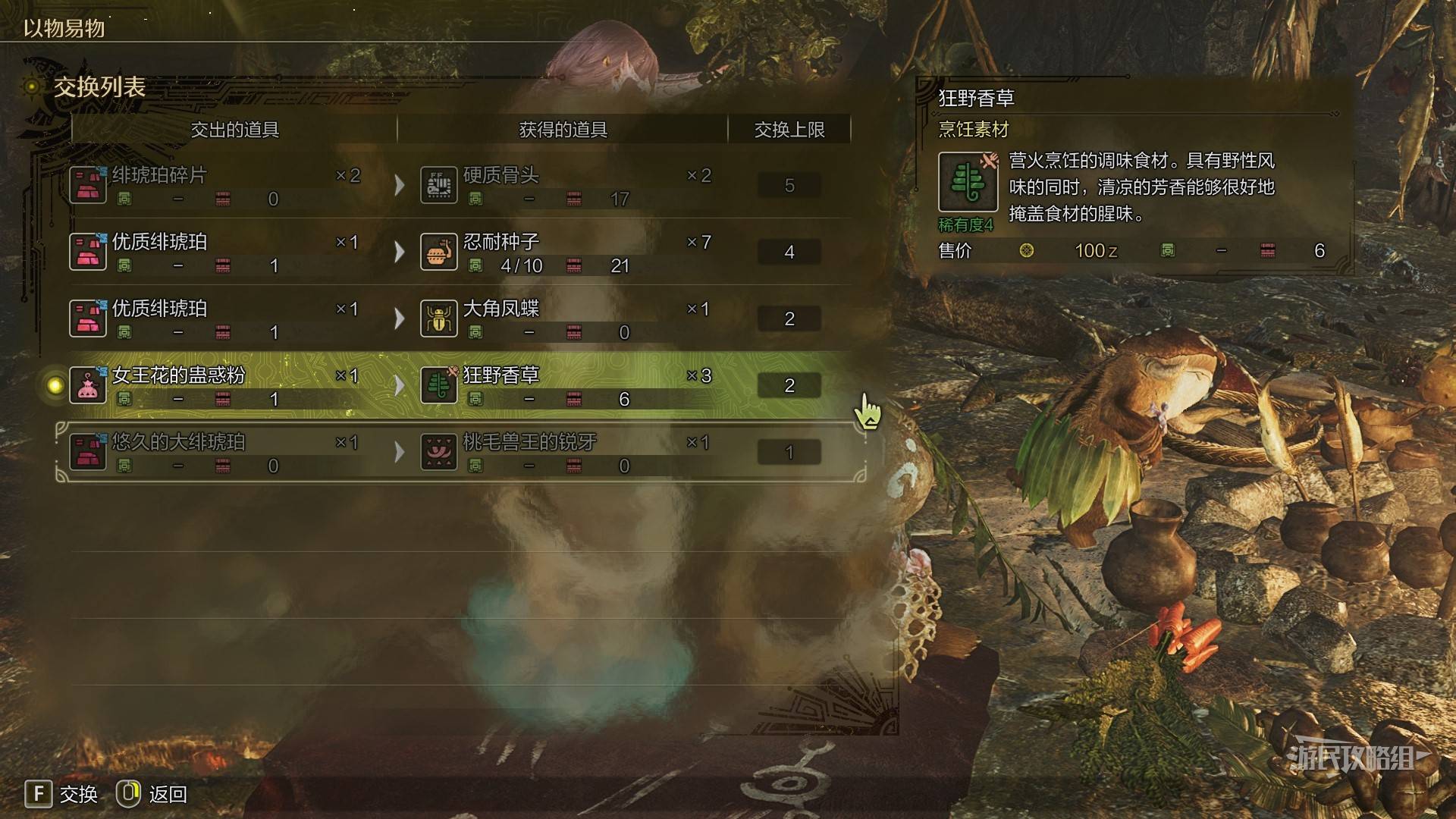 女王花的蛊惑粉可与绯红森林【森狸人之家】的【好眼菇】交换怪物素材或烹饪素材,与他对话一次后,在个人营地中与纳塔对话直接进行以物易物。注意每次休息后可换的道具会随机更换。找不到好眼菇时,可以在营地休息切换昼夜,有些NPC会移动或在某些时段无法交易。