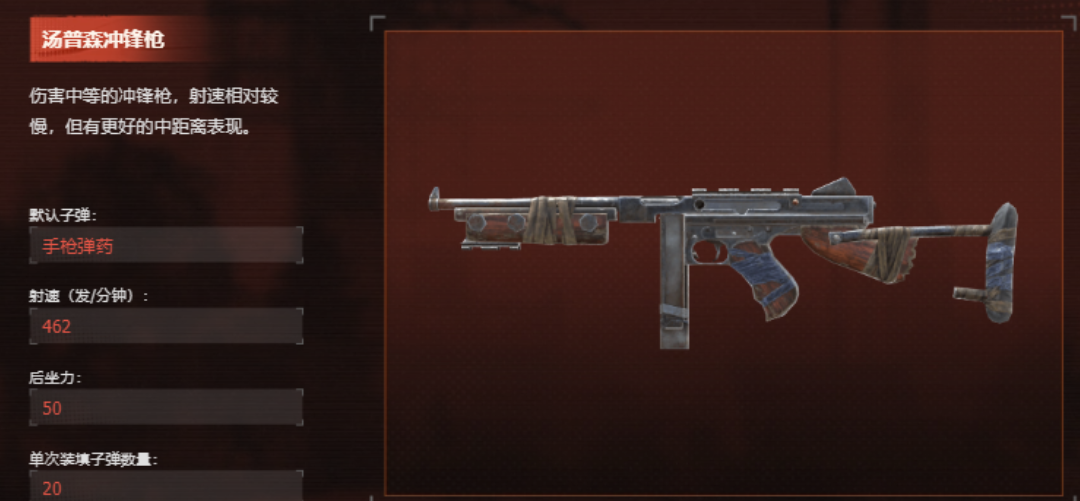 接下来,汤姆逊冲锋枪以其中等的伤害和高射速在战斗中占有一席之地。它在中近距离交战时表现出色,能够迅速压制敌方火力。特别是在敌人悄悄逼近时,汤姆逊冲锋枪能带来意想不到的惊喜,帮助玩家迅速掌控战斗节奏。其20发的子弹容量也恰到好处,适合在激烈的战斗中使用。