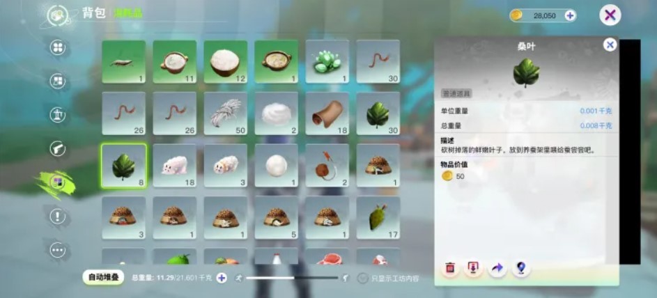 随处可见的上桑树,不过桑叶的掉落率极低,只能说找至大一点的上桑树,然后拼脸了。如果找人帮忙,能提前去雨林砍通天树和旅人枫的话,爆率会大幅提升。