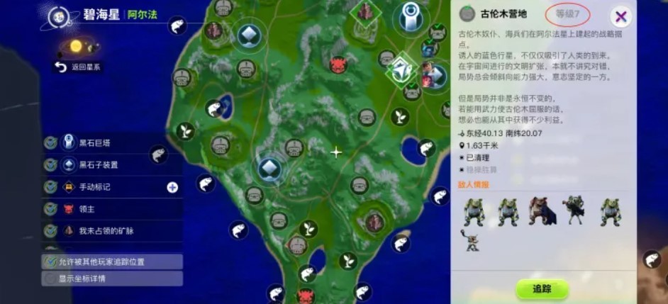 通关营地等级不是7级,先去摸完所在大陆上的四个黑石子装置,就可以看到所有营地了,这个时候再点击任务追踪七级营地的位置,通关就可以完成任务了。七级营地的boss伤害很高,还会附带两个飞行兵,建议先清掉飞行兵,然后血少的时候可以先跑远一点拉脱回复状态。