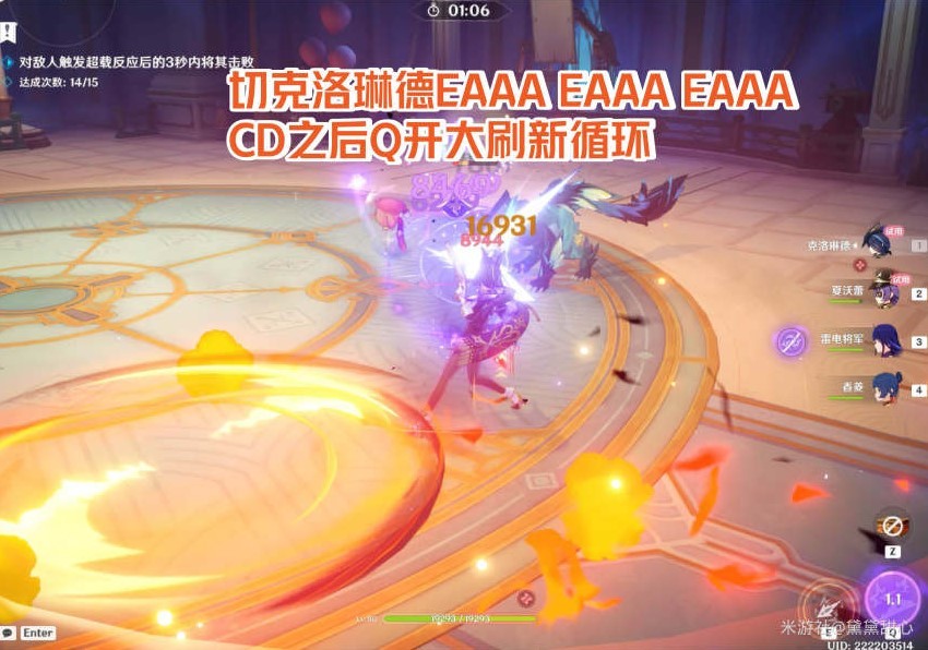 攻略二·巨能侵彻的崩破:配队情况:克洛琳德、夏沃蕾、雷神(下位替代皇女、久岐忍等)、香菱(班班、托马)。输出手法:夏沃蕾EQ→雷神E(皇女、久岐忍E)→接香菱EQ→切克洛琳德EAAA循环ECD的时候Q开大循环