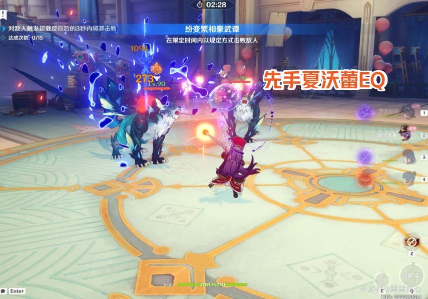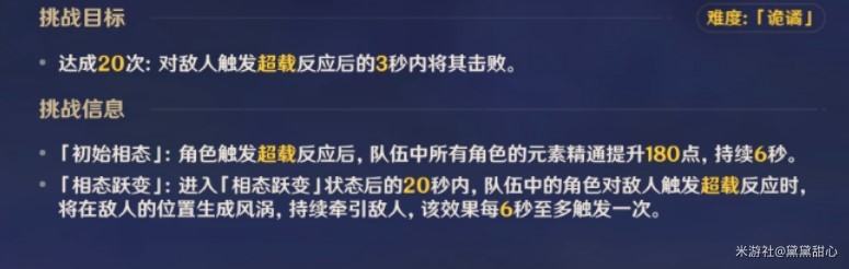 玩法规则:每个关卡需要以特定方式击败敌人。第一关卡需要在超载反应后的3秒内击败敌人20次。击败敌人将积累相变参量,积累足够参量后将获得「相态跃变」增益Buff,可聚怪