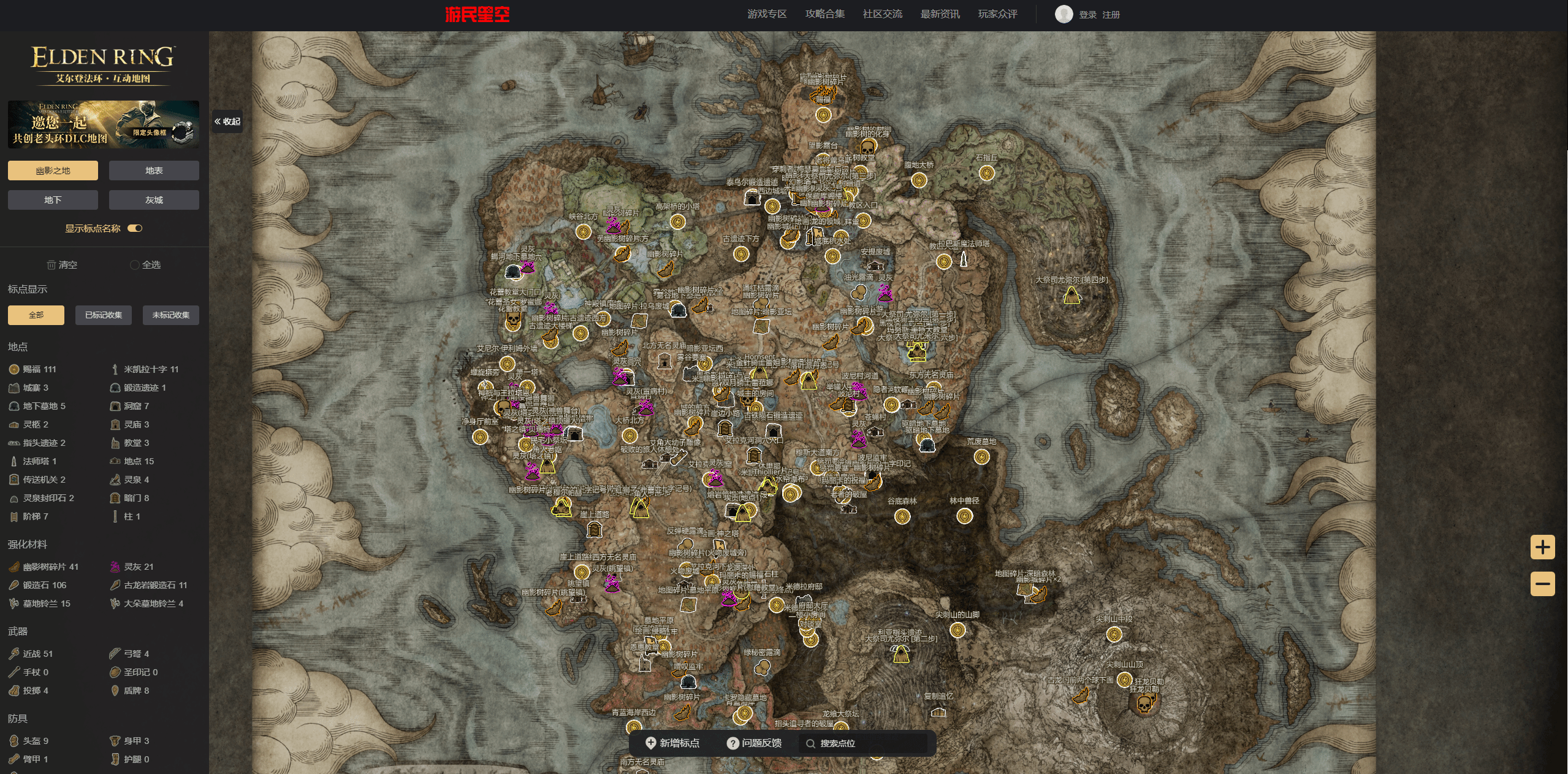地图持续填充与优化中,力求做到最全最详尽。欢迎协助编辑互动地图,如发现尚未添加的点位,可通过“新增点位”按钮添加标点,或协助编辑与纠错现有点位,共建全网最好的《艾尔登法环》互动地图!