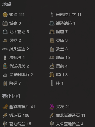 除新装备外,DLC的2个重要强化资源「幽影树碎片」和「灵灰」的详细收集点位也已标注在地图上。建议优先收集幽影树碎片,可提升幽影树庇护等级,增加攻击力和减伤率;灵灰庇护则可进一步强化骨灰、灵马等级,让你更轻松地驰骋幽影之地。
