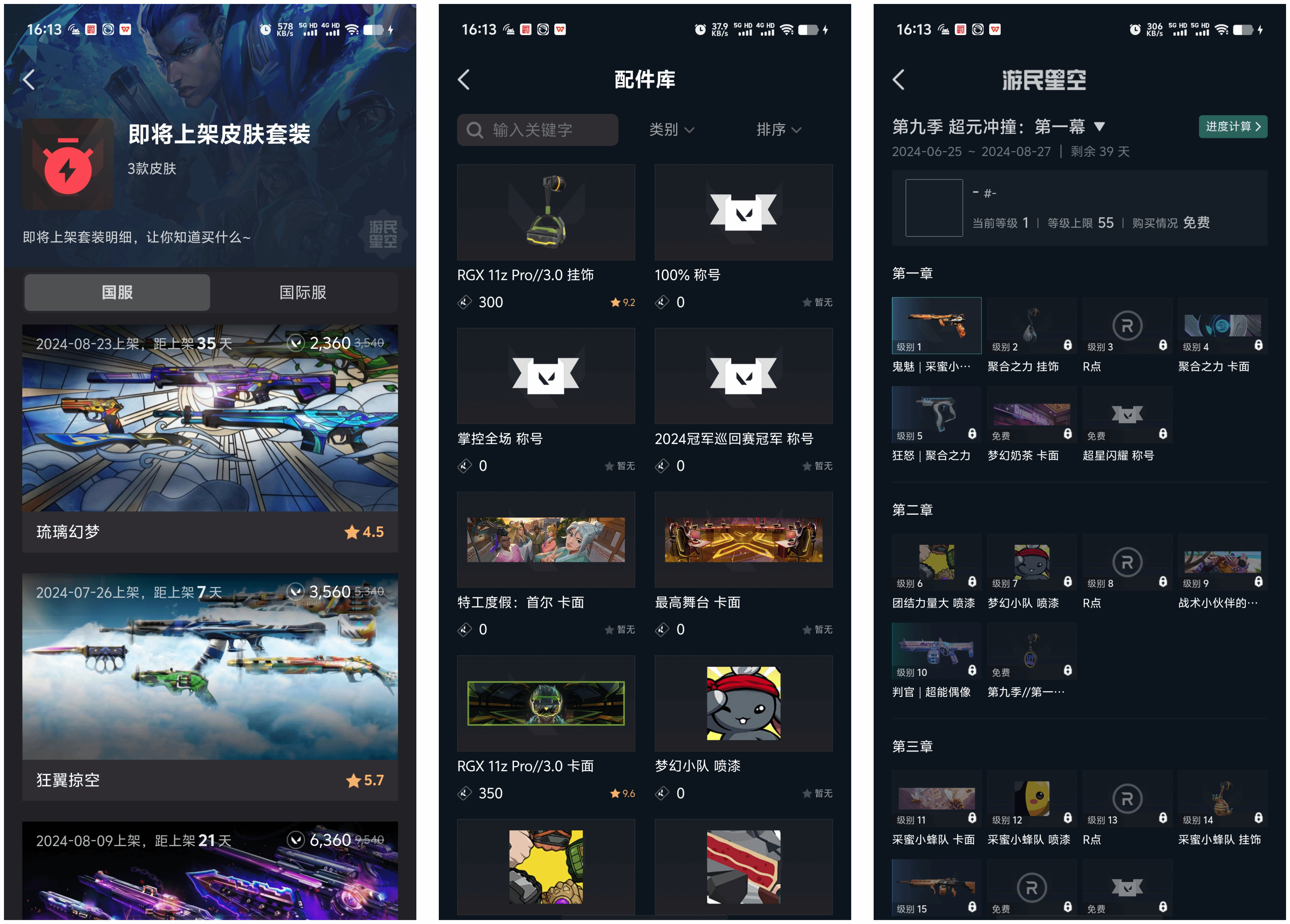 除此之外,游民皮肤站还收录了配件库、通行证内容及进度、即将上架皮肤的信息等多种功能,是国内最全面的《无畏契约》皮肤资料库。