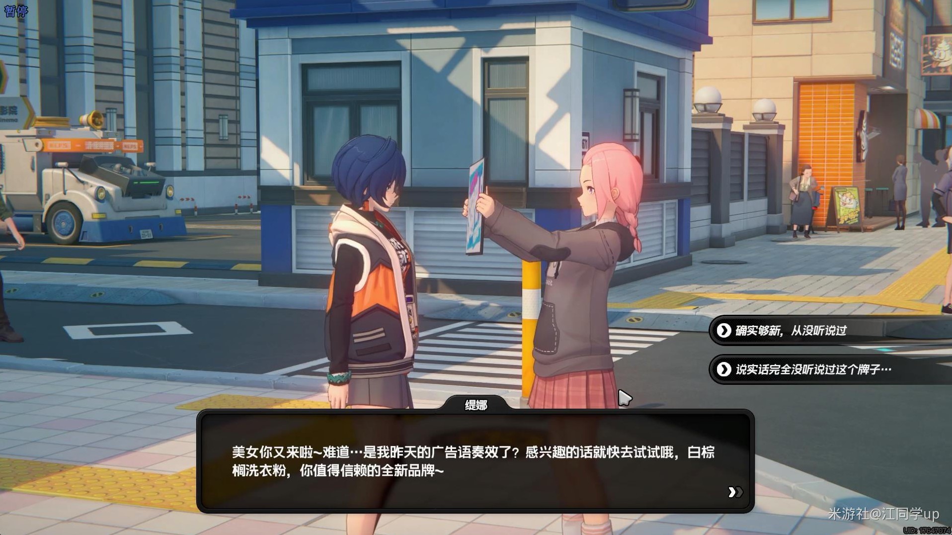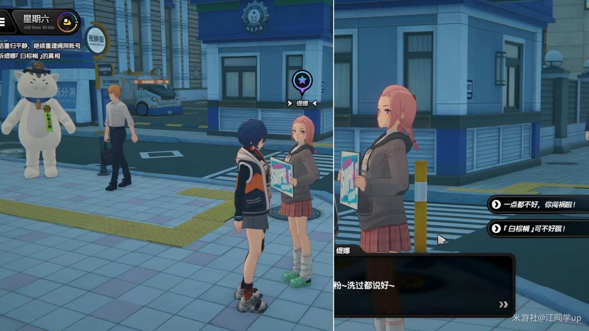 2.将游戏时间调整到第2天前3个时间段,先传送到其他地图,再传送到【光映广场-喵吉长官】,与【缇娜】进行第2次对话。选择【确实够新,从没听说过】,后面随意选择对话。如果第2次上午【缇娜】不在,可将游戏时间调整到下午。