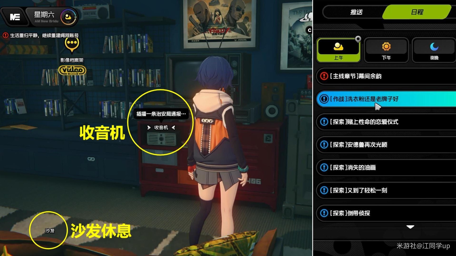 3.将游戏时间调整到第3天,在【沙发】上休息,将游戏时间调整到第3天后,【沙发】前的【收音机】会被激活。调查【收音机】后,接到【作战委托-洗衣粉还是老牌子好】。