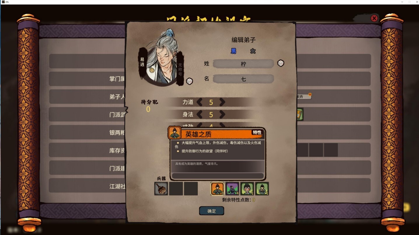 因为资质的关系,你第一代的弟子大部分都是工具人,负责门派的管理,类似外门长老,只留一个带英雄之质的内门弟子作为前排坦克,开局四个弟子,有几个很重要的特性一定要点上