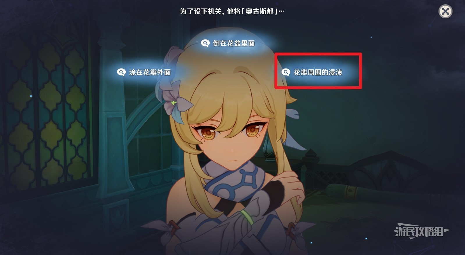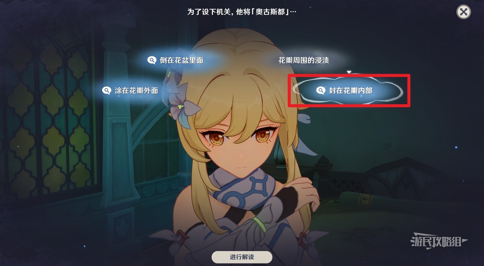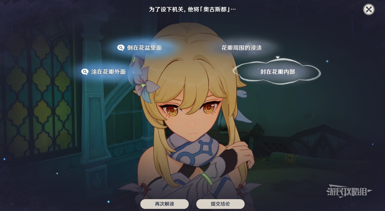 开始推理后,首先解读花瓣周围的浸渍,然后解读封在花瓣内部,最后提交结论。