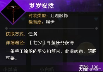 全部完成后获得头部饰品【岁岁安然】(衣品100)和60个夜晶。