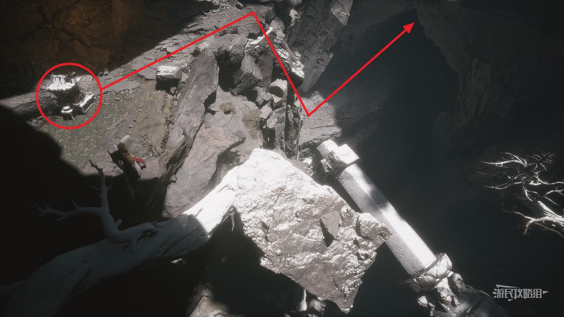 从第三回土地庙【小西天-极乐谷-一念壁】出发,面对篝火往右侧山崖下方看,可以看到山崖之间横着一条石柱,从山崖边跳到石柱所在的那层,往石柱旁边转视角可以看到一个山洞,进入山洞。