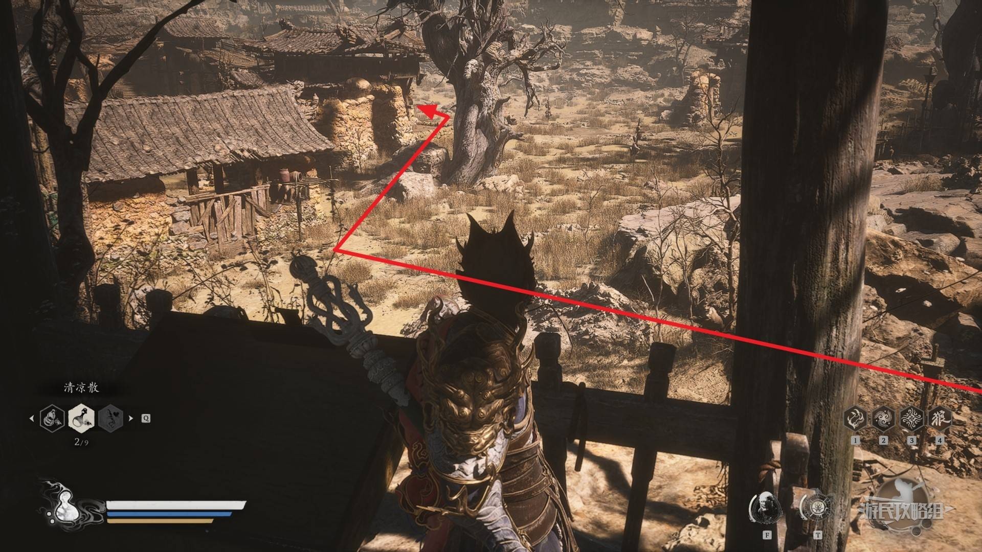 从第二回【黄风岭-沙门村-村口】土地庙出发,过桥往右侧高处的亭子方向走。