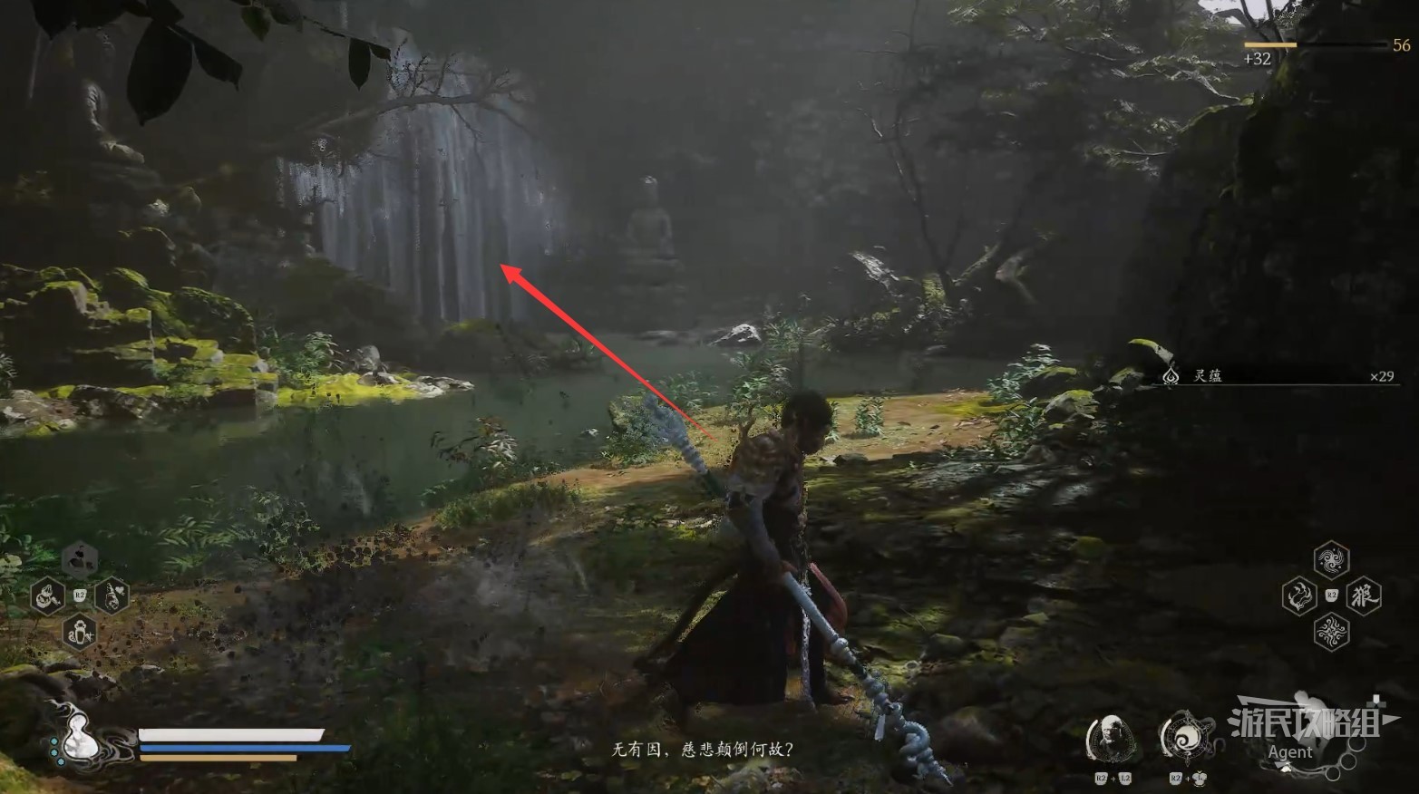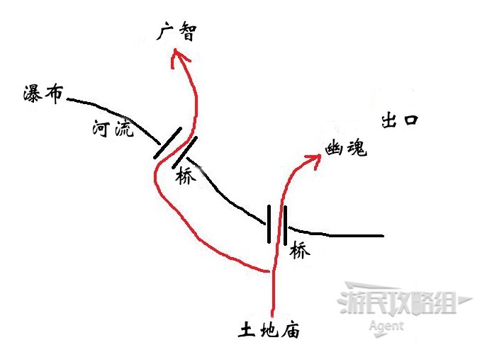 参考图示,从土地庙出发,瀑布就在最左边,一直往左走就能找到。