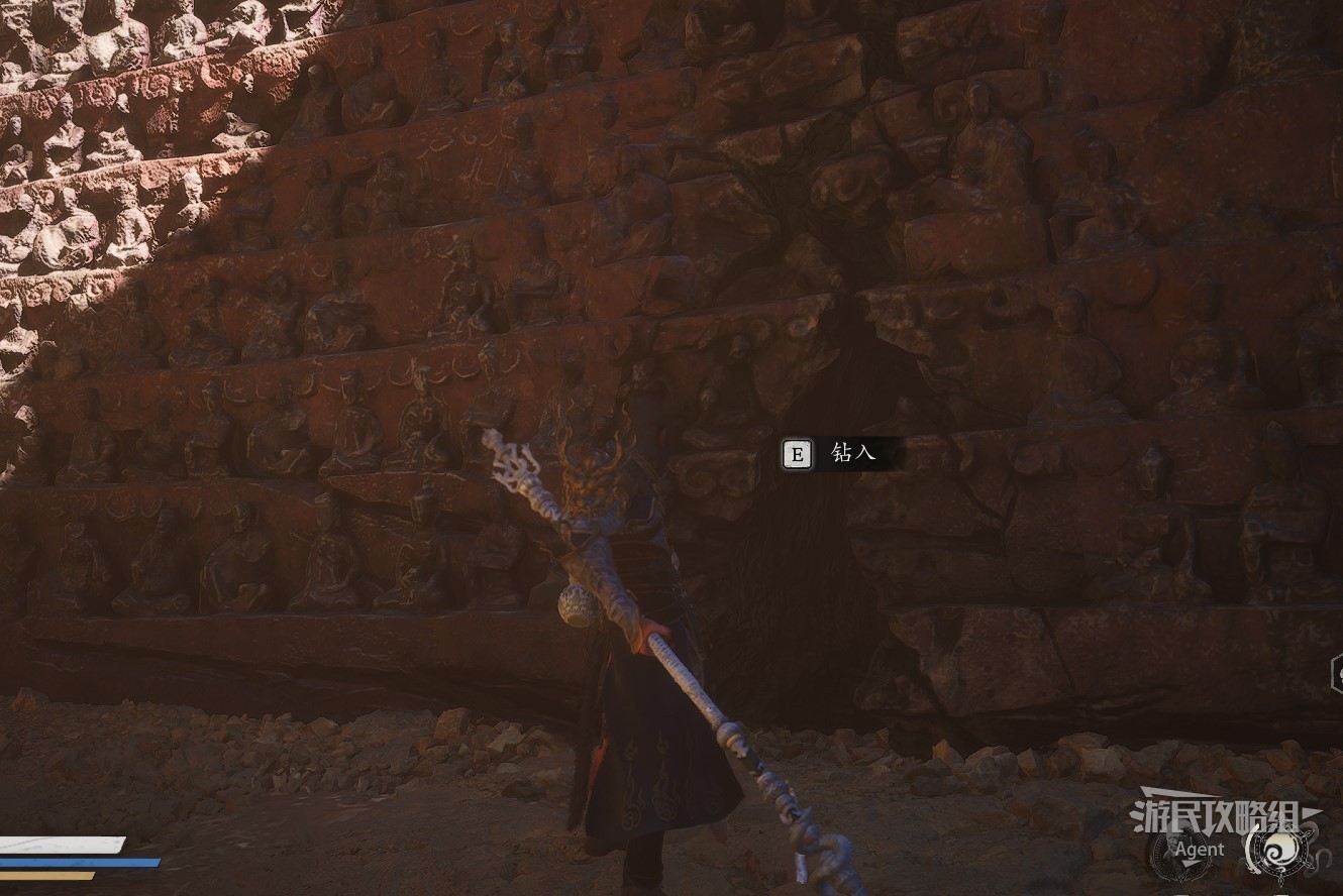 从“沙门村-不济谷”土地庙出发,走石门左边的路最近,见到沙大郎。打沙大郎时,吸引他去撞这堵很多小佛像的墙,可以撞开一条裂缝。等打完沙大郎,进入裂缝开宝箱得到【飞龙鳞片】,这是触发每关的隐藏BOSS龙的道具。
