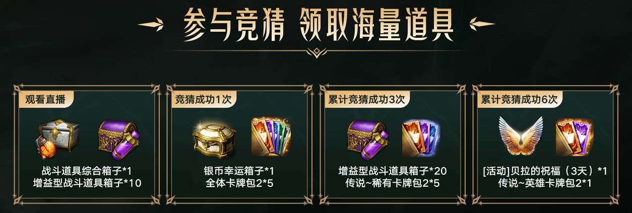 观看直播即可领取【战斗道具综合箱子】*1、【增益型战斗道具箱子】*10。竞猜成功1次即可领取【银币幸运箱子】*1、【全体卡牌包2】*5。累计竞猜成功3次即可领取【增益型战斗道具箱子】*20、【传说~稀有卡牌包2】*5。累计竞猜成功6次即可领取【[活动]贝拉的祝福(3天)】*1、【传说~英雄卡牌包2】*1。
