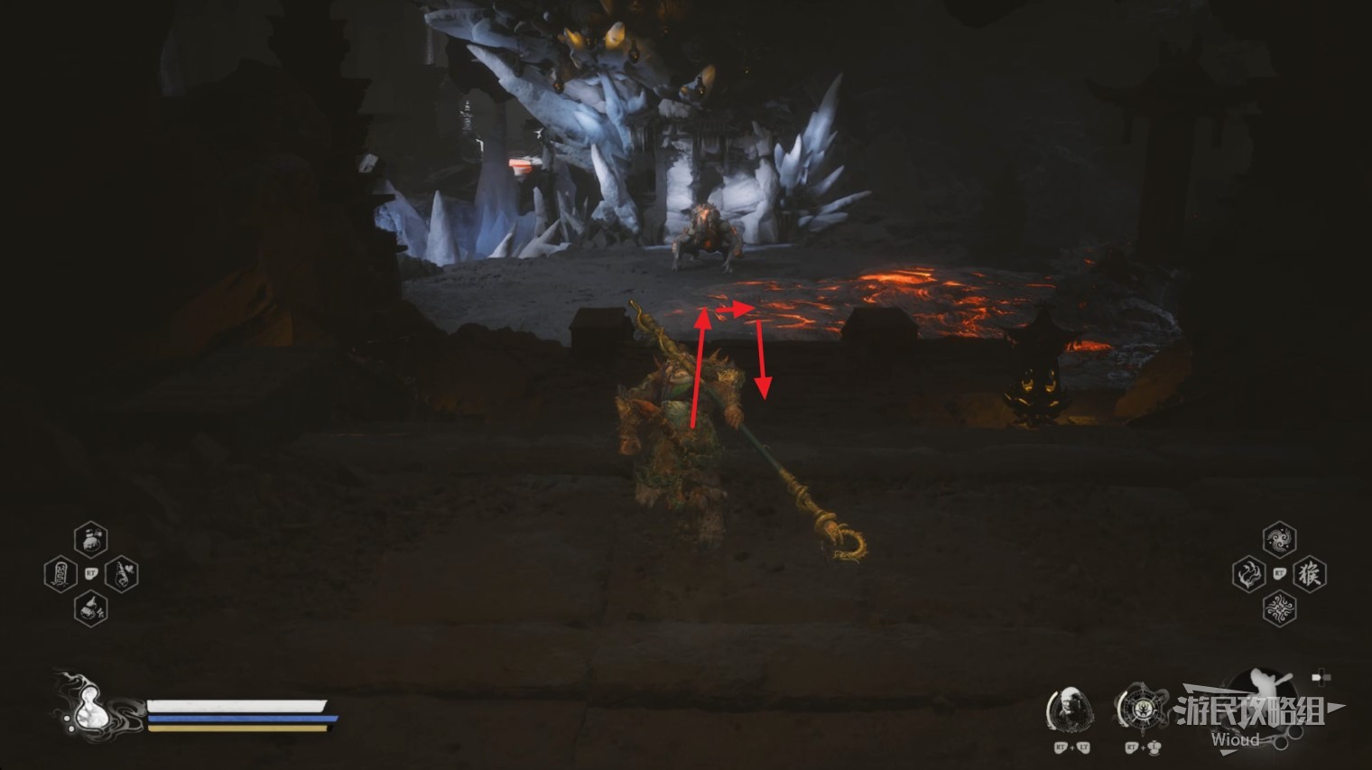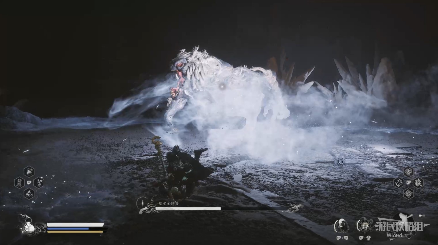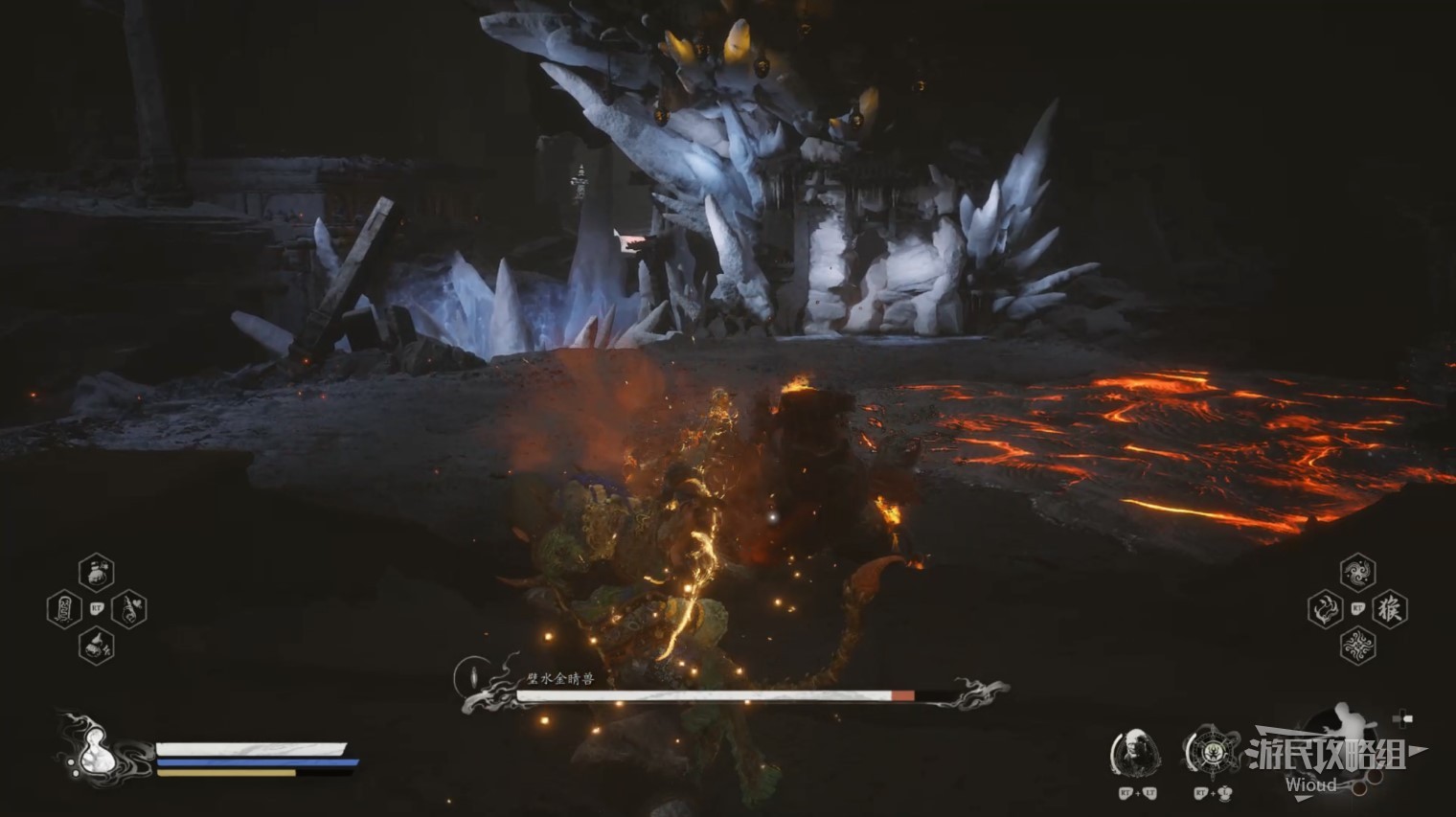否则会被璧水金睛兽压制而降低容错率,而且璧水金睛兽的血条很厚,通常开局定身术+身外身法组合无法对璧水金睛兽造成有效伤害,因此还是以躲避+普攻攒重击的流程为主,底下还会介绍一种逃课方法。