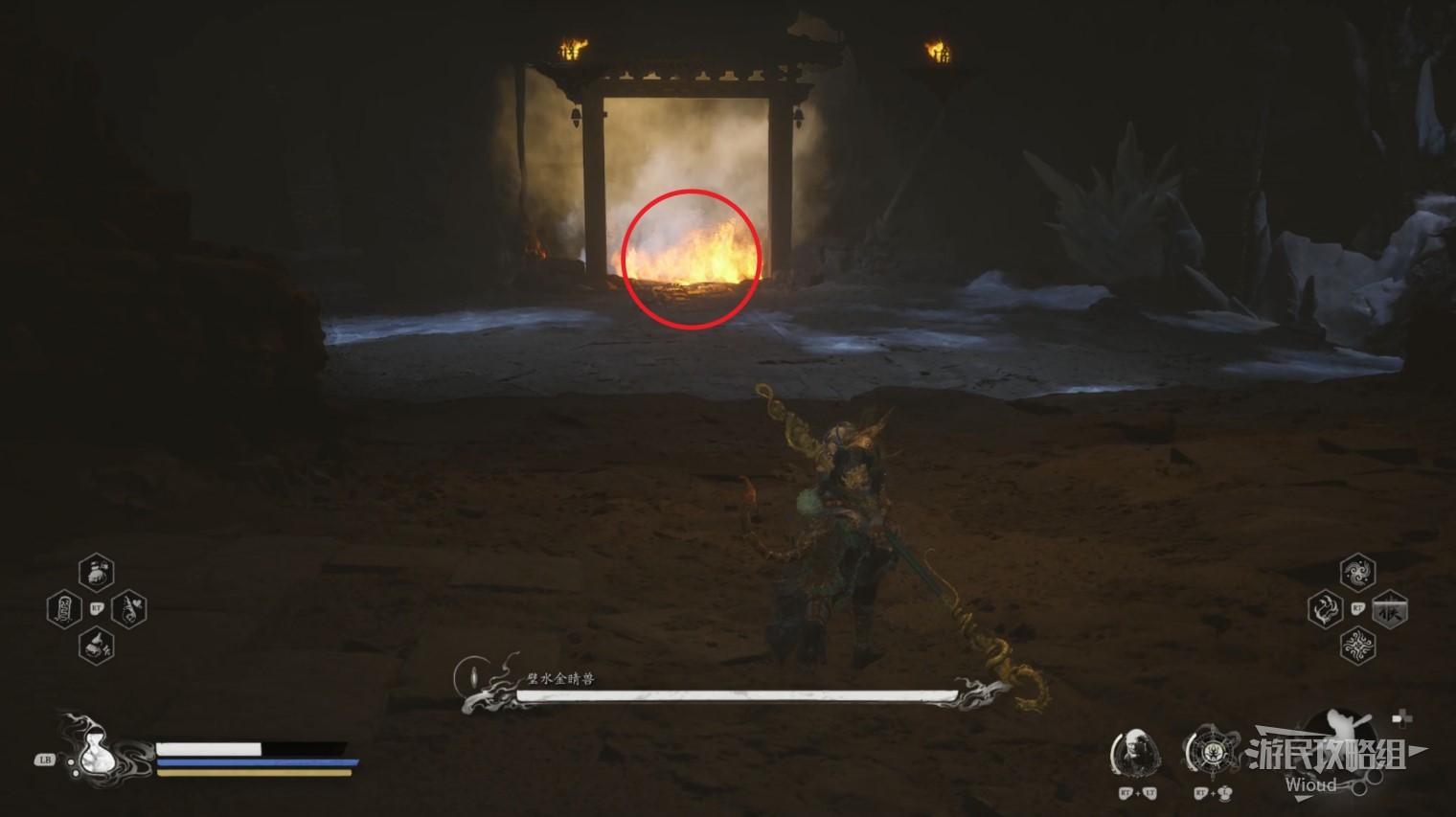 来到第二个战斗场地可以看到第二次与璧水金睛兽战斗场地的前方被一团火挡住,而璧水金睛兽的第二心态是冰形态的,我们要模仿第一形态那样站在下图画圈的位置,一直躲避璧水金睛兽的技能,等待一个冰形态的吐息浇灭火焰继续沿路走到达下一个场景触发第三形态。