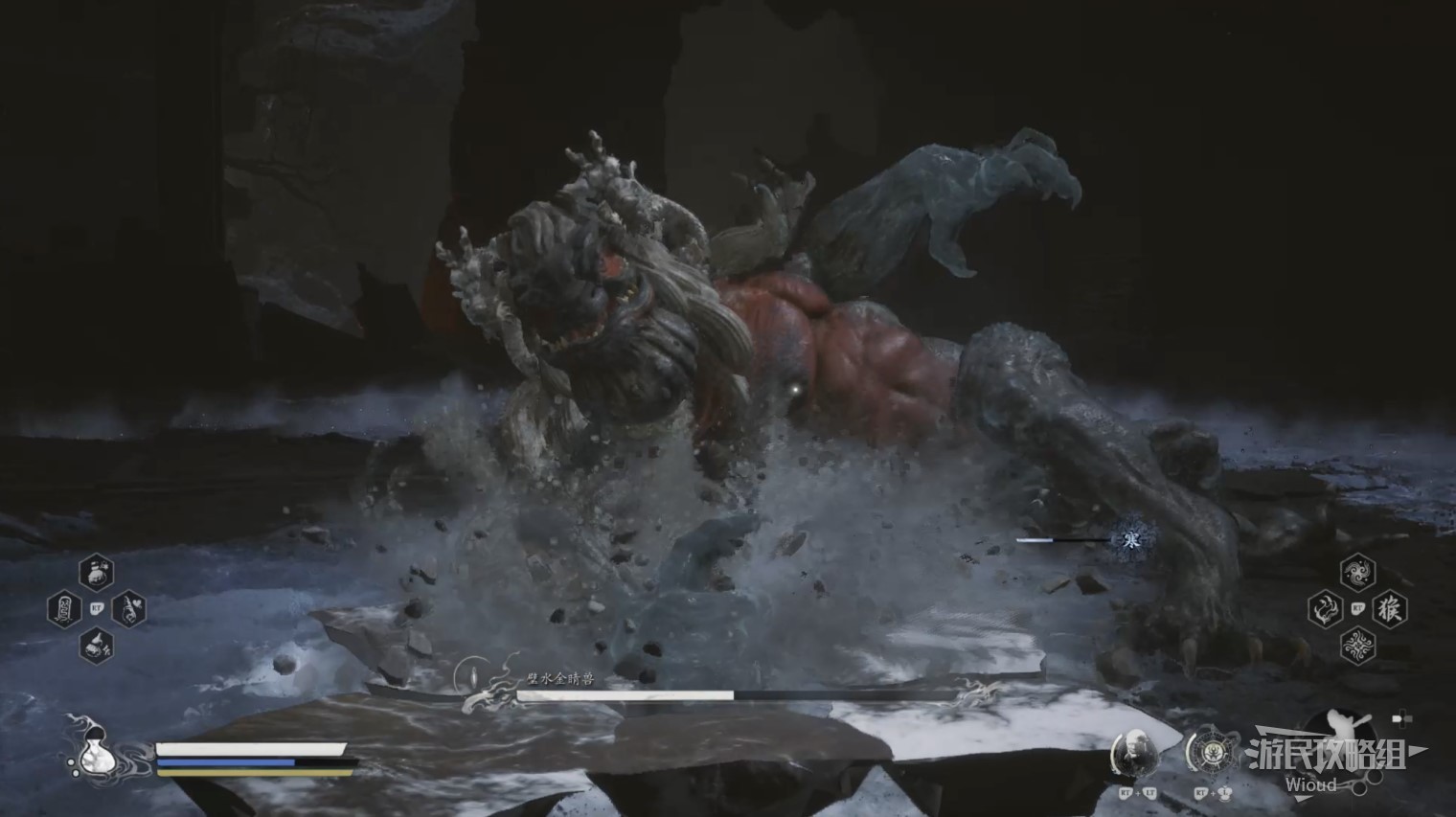 等待璧水金睛兽吐火时即可烧化此处的冰,玩家这时就可以通过冰缝走到下一个区域,然后璧水金睛兽也会追到下一个区域进入第二形态;下面先介绍第一形态的技能。