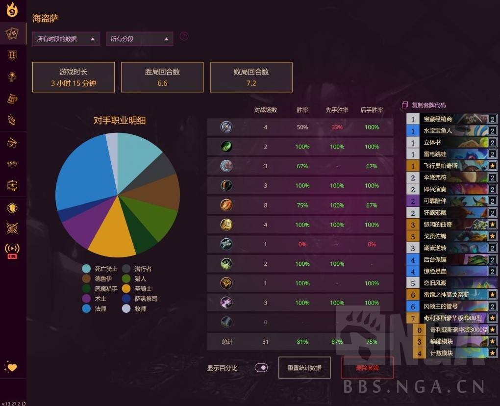 海盗萨卡组适合对局时间短、同时优开海盗瞎、大法术法、德鲁伊的环境。构筑值得优化的点在于5费法术和图腾的使用。