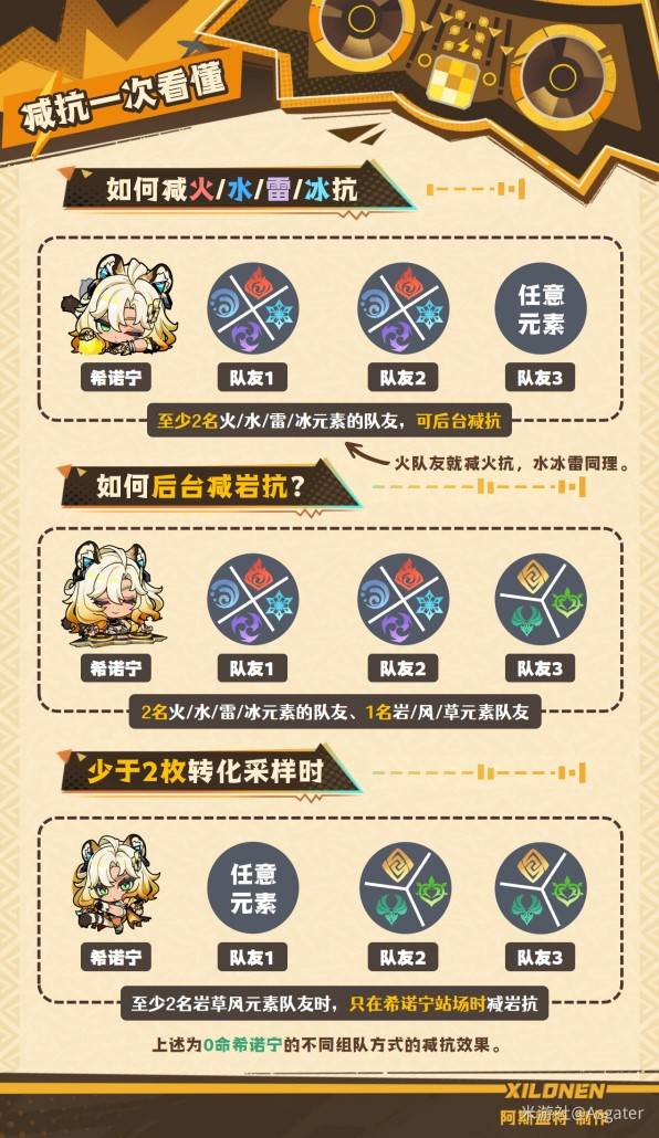 ② 该命座可让岩采样始终保持激活状态——这一效果的前提是队内有至少1名岩元素队友(不含希诺宁)。这一效果是希诺宁在三岩队也能后台减岩抗的关键。
