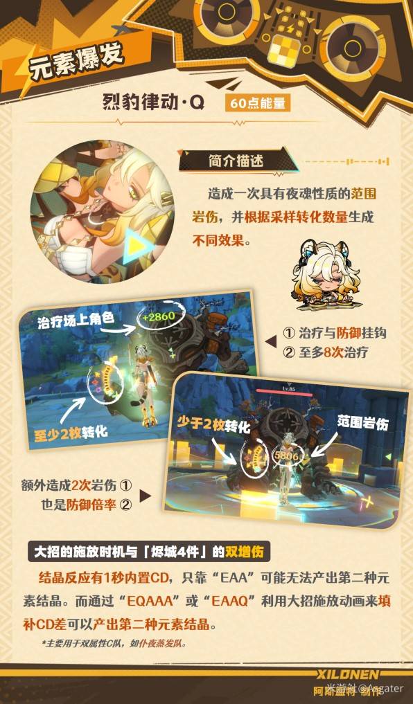 ④ 大招的表层作用是提供治疗(少于2枚转化采样),深层作用是配合战技触发两种元素结晶——触发【勇者4件】、达到“双元素增伤”的目的。