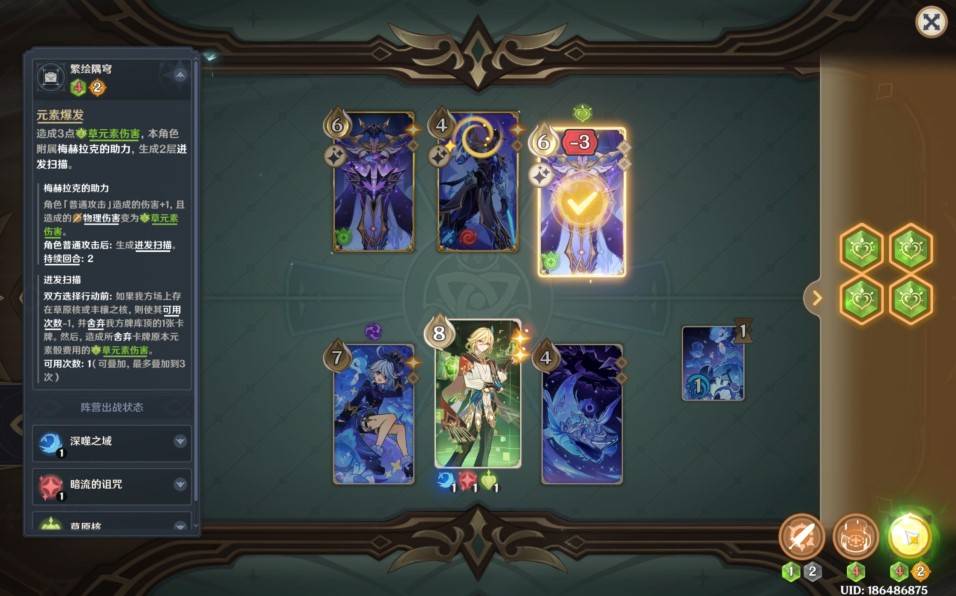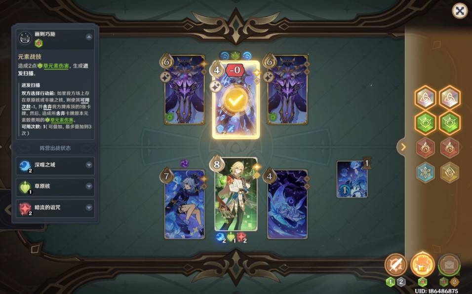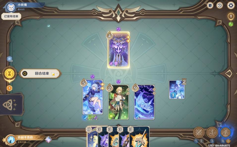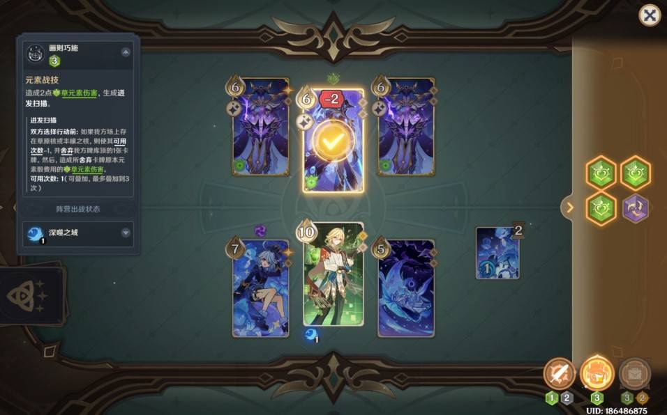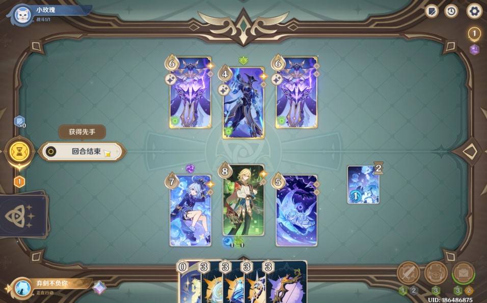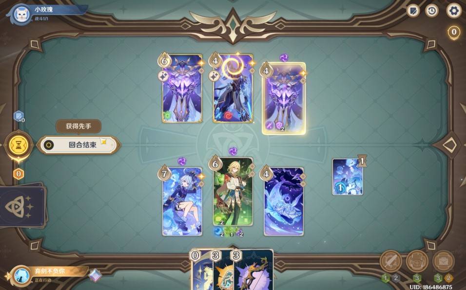 回合1骰子需求:水骰*3、草骰*3,投掷阶段找水、草骰子即可。