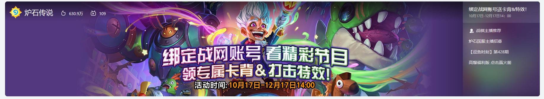 福利来袭!10月17日起,绑定战网通行证和斗鱼或虎牙账号,即可获得专属奖励!别错过限时活动哦~