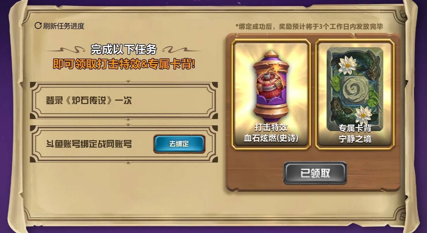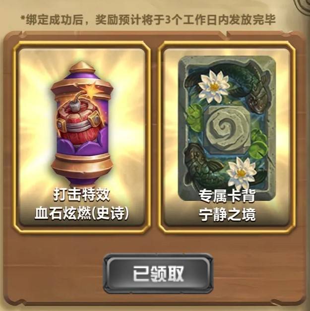 当前位置:首页 → 攻略 → 炉石传说直播平台卡背与打击特效领取教程