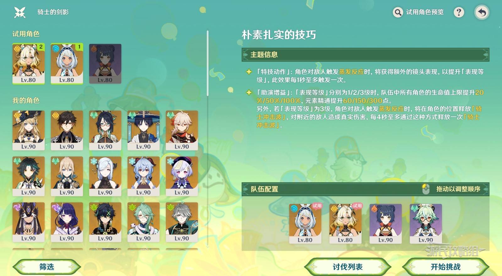 《原神》5.1版本花神诞祭活动中,“骑士的剑影”挑战推荐阵容。